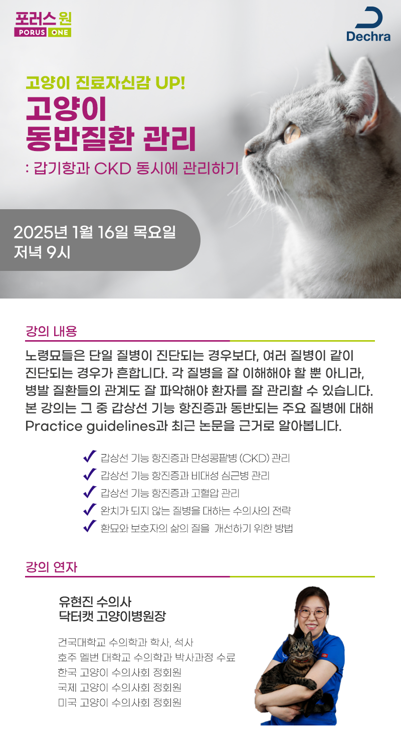 글로벌 동물용의약품 전문기업 데크라(Dechra)의 한국지사 데크라 코리아가 ‘고양이 동반질환 관리’를 조명하는 포러스원 웨비나를 개최한다.