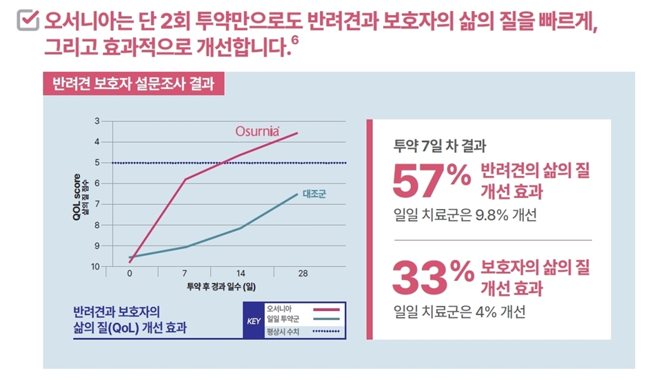 데크라코리아 측은 “실제 보호자 설문에서도 투약 7일차에 반려견 삶의 질 57%, 보호자 삶의 질 33% 개선이 보고됐다”고 설명했다.